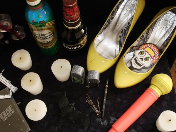 La mayoría de las cosas las he comprado en pueblos michoacanos y por supuesto que en estos días me apegué a un estricto régimen de desayunar pan de muerto. Le puse a Amy un poco de whiskey, un poco de tequila en botella edición especial Pineda Covalín, una bohemia, pasadores para que se sujete la peluca, un delineador negro, un micrófono y muchas velas. Ojalá le haya gustado. Y ojalá el año que viene el altar sea para alguno de mis perros muertos. No hay necesidad de pretextos para poner un altar.